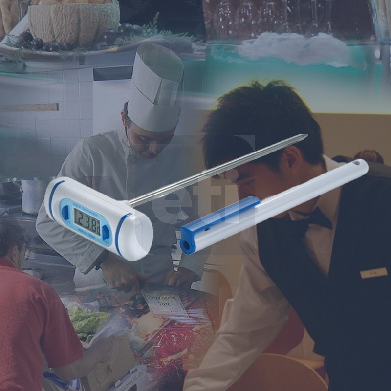 Pocket thermometer – T-shaped. This handy-sized pocket thermometer measures temperature over the range of -49.9 to 149.9°C. The thermometer features a Ø3.5 x 120mm stainless steel penetration probe. The thermometer incorporates a °C/°F switch and a display hold feature. Each unit is supplied with a probe cover that incorporates a pocket clip.